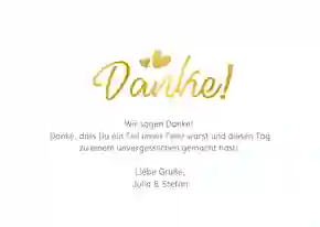 Andere Extras, mit denen du deine Hochzeitskarte mit eigenem Foto noch mehr in Szene setzen kannst, sind glänzender Foliendruck, tolle Verschluss- sowie Adressaufkleber und farbige Umschläge. Schau selbst, was am besten zu deiner Karte passt!