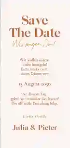 Moderne Hochzeitskarten können in verschiedenen Stilen, Designs und Formaten gestaltet werden. Entscheide zunächst, welcher Stil und welches Design am besten zu deiner Hochzeit passt. Viele Paare bringen das Hochzeitsthema bereits in den Save-the-Date-Karten, Einladungskarten oder in den Menükarten mit ein. Dies machst du beispielsweise durch das Hinzufügen von passenden Rahmen oder Stickermotiven, in denen sich dein Hochzeitsthema widerspiegelt – ein kleiner Vorgeschmack auf die Feier!