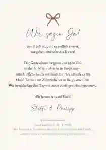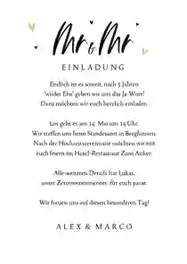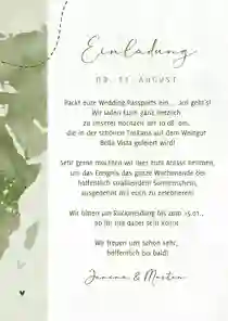 Damit du deinen Gästen ein durchgehendes originelles Erlebnis schenkst, verschick doch die Save-the-Date-Karten, die Hochzeitseinladung und die Dankeskarten Hochzeit im gleichen Design. Die Überraschung ist perfekt, wenn du eine Videobotschaft in die Karte verpackst. 🎥 Das funktioniert mit einem QR-Code und ist die Extraportion Außergewöhnliches auf deinen Hochzeitskarten. An deinem großen Tag verschönerst du die Hochzeitstafel mit Menükarten im gleichen Look, verwendest originelle Deko und verzauberst mit deinem Charme. Denn Hochzeitsvorbereitungen sind so viel mehr als ein Stück Papier. Finden wir. 💞