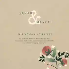 Als Alternative zum englischen Klassiker kannst du deine Hochzeit natürlich auch auf Deutsch ankündigen. „Haltet euch den Termin frei!“, „Wir heiraten!“ oder „Reserviert euch unseren Hochzeitstag!“ sind zum Beispiel beliebte Pendants, die fast alles sagen, was deine Gäste wissen müssen. Das geplante Hochzeitsdatum und die beiden Namen dazu – und schon hast du eine stilvolle Save-the-Date-Karte, die deinen besonderen Tag auf ganz persönliche Weise ankündigt.