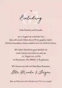 Ob 1, 10 oder 50 Jahre – ein Hochzeitstag ist ein ganz besonderer Moment im Leben vieler Paare. Schreib ein paar persönliche Worte auf die Karte zum Jubiläum. Was macht euch als Paar so besonders? Was habt ihr in den letzten Jahren gemeinsam erreicht? Wofür seid ihr besonders dankbar? Schöne Zitate, Gedichte oder Sprüche über die Liebe untermauern deine Worte auf der Einladung zum Jubiläum.
