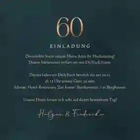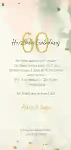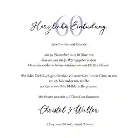 60 Jahre Ehe – eine Verbindung, die gefeiert werden sollte. Lade deine Liebsten mit personalisierten Jubiläumskarten zur Feier deiner diamantenen Hochzeit ein und erlebe diesen unvergesslichen Tag gemeinsam! Ob im kleinen Kreis zu Hause oder in einer festlich geschmückten Location: Mit einer persönlichen Einladungskarte setzt du den passenden Rahmen für dein Jubeljubiläum.