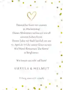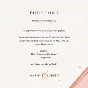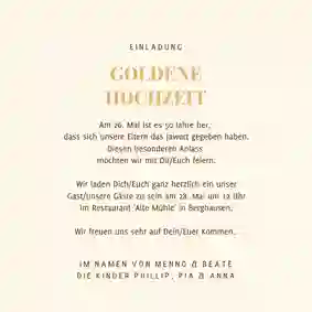 „Als wir uns vor 50 Jahren das Ja-Wort gegeben haben, hätten wir nicht gedacht, dass wir nach einem halben Jahrhundert wieder feiern – und wir lieben uns mehr denn je! Darum feiern wir am XXX um XXX unsere goldene Hochzeit im XXX. Dazu laden wir dich herzlich ein, denn es soll ein Fest mit all unseren Herzensmenschen sein.“