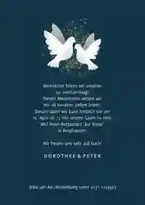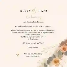 „Als wir uns vor 50 Jahren das Ja-Wort gegeben haben, hätten wir nicht gedacht, dass wir nach einem halben Jahrhundert wieder feiern – und wir lieben uns mehr denn je! Darum feiern wir am XXX um XXX unsere goldene Hochzeit im XXX. Dazu laden wir dich herzlich ein, denn es soll ein Fest mit all unseren Herzensmenschen sein.“