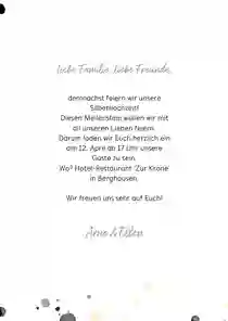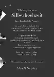 Eine Jubiläumskarte mit Foto zur Silberhochzeit kann beispielsweise mit silbernen Stickern und Rahmen verziert werden. Füge eine große 25 hinzu oder den Satz ‘25 Jahre verheiratet’. So wissen die Empfänger direkt, was der Anlass deiner Jubiläumskarte mit Foto ist. Auch die Fotos lassen sich mit Fotoeffekten bearbeiten, heranzoomen und verschieben.