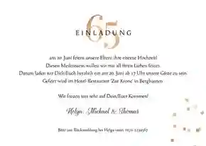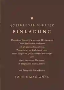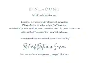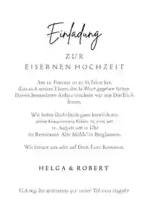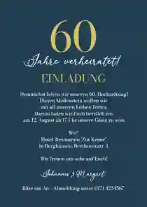 Bist du bereits 60 Jahre verheiratet? Dann darfst du auch diesen ganz besonderen Moment feiern! Lade deine Gäste mit einer Jubiläumskarte mit Foto zur Diamantenen Hochzeit ein. Entwerfe deine Karte online und füge eigene Texte und Fotos hinzu. Ein Hochzeitstag ist der perfekte Anlass, um eine Foto-Jubiläumskarte zu gestalten.
