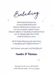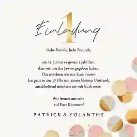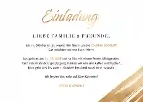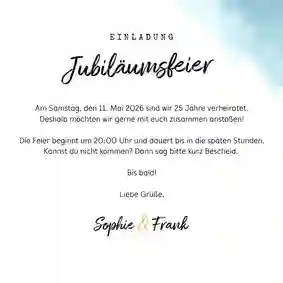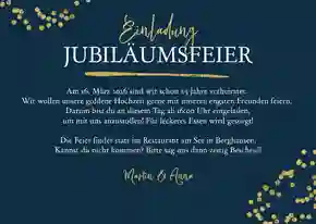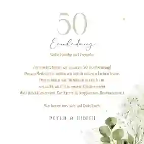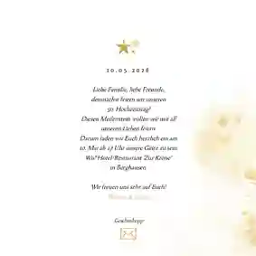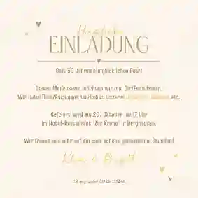 Auch das 50-jährige Jubiläum ist ein unvergesslicher Tag, der gebührend gefeiert werden sollte. Widme diesem Tag eine persönliche Jubiläumskarte mit Foto. Füge gerne auch mehr Fotos hinzu, denn nach 50 Jahren Ehe hast du bestimmt viele tolle Erinnerungsfotos. Erstelle zum Beispiel eine Fotocollage oder entscheide dich für eine Doppelkarte und füge auf der Vorder- sowie auf den Innenseiten eigene Fotos hinzu.
