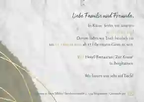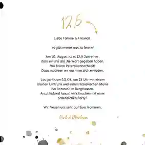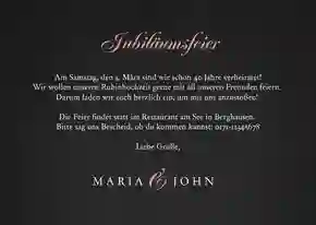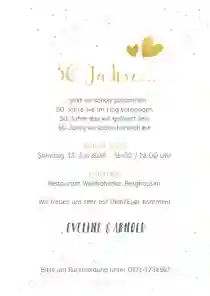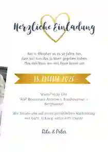 Auch das 50-jährige Jubiläum ist ein unvergesslicher Tag, der gebührend gefeiert werden sollte. Widme diesem Tag eine persönliche Jubiläumskarte mit Foto. Füge gerne auch mehr Fotos hinzu, denn nach 50 Jahren Ehe hast du bestimmt viele tolle Erinnerungsfotos. Erstelle zum Beispiel eine Fotocollage oder entscheide dich für eine Doppelkarte und füge auf der Vorder- sowie auf den Innenseiten eigene Fotos hinzu.