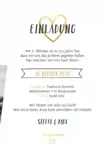 Auch das 50-jährige Jubiläum ist ein unvergesslicher Tag, der gebührend gefeiert werden sollte. Widme diesem Tag eine persönliche Jubiläumskarte mit Foto. Füge gerne auch mehr Fotos hinzu, denn nach 50 Jahren Ehe hast du bestimmt viele tolle Erinnerungsfotos. Erstelle zum Beispiel eine Fotocollage oder entscheide dich für eine Doppelkarte und füge auf der Vorder- sowie auf den Innenseiten eigene Fotos hinzu.
