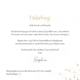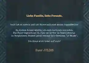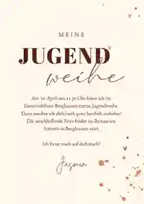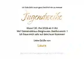Am XX.XX.XXXX um XX.XX Uhr möchte ich meine Jugendweihe feiern und lade euch dazu herzlich ein. Ich freue mich auf euch!“