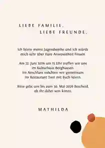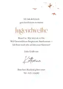 Am XX.XX.XXXX um XX.XX Uhr möchte ich meine Jugendweihe feiern und lade euch dazu herzlich ein. Ich freue mich auf euch!“
