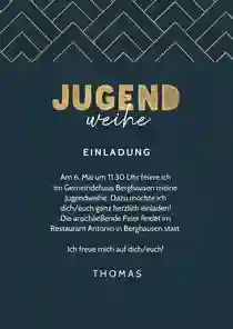 Trendy Dankeskarte zur Jugendweihe mit grafischem Muster, Platz für mehrere Fotos und goldenem Foliendruck (wahlweise).