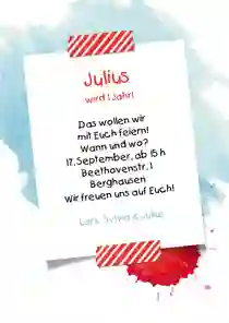 🎉 Tipp: Wenn du deine Einladungskarten zum 1. Geburtstag selber machst, bestelle direkt 1–2 Karten extra, sodass du und dein Kind jeweils eine Karte als Erinnerungsstück haben. Die Einladung zum 1. Geburtstag eignet sich perfekt für die Erinnerungskiste.