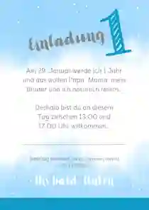 Viele Eltern entscheiden sich zum 1. Geburtstag ihres Sohnes für Einladungskarten in Blau, Grün oder Beige. Niedliche Motive geben den Einladungen eine besondere Ausstrahlung. Deshalb findest du bei uns Karten mit Autos, Flugzeugen, Baggern oder niedlichen Tiermotiven. Auch Luftballons, Konfetti und eigene Fotos finden einen Platz auf den Einladungskarten für Jungen.