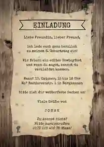 Eine tolle Idee ist es auch, die Karte wie ein Wanted- oder Gesucht-Poster zu gestalten. Auf der Geburtstagsfeier selbst kannst du dann beispielsweise eine Spurensuche organisieren. Schau dir dazu einfach unsere Vorlagen zum Cowboy und Indianer Kindergeburtstag an und bearbeite diese nach Wunsch.