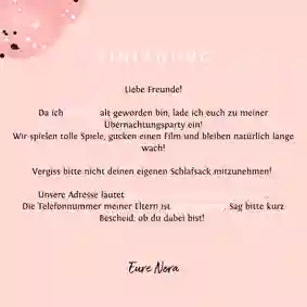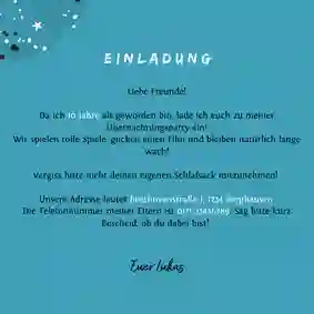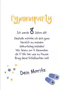 Feiert deine Tochter oder dein Sohn bald eine Übernachtungsparty? Dann ist eine passende Einladung dazu natürlich sehr schön. Unsere Designer haben speziell für diesen Anlass Einladungen entworfen, die du natürlich ganz individuell gestalten kannst. Gestalte zum Beispiel eine Einladungskarte mit deinem eigenen Foto und platziere schöne Abbildungen in der Einladung zur Übernachtungsparty.