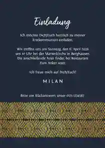 - Stil festlegen: Entscheide dich für eine klassische Karte in zeitloser Gold-Optik, für eine christliche Einladung mit passenden Symbolen oder für ein einzigartiges Vintage-Design! Die Wahl liegt ganz bei dir – und natürlich deinem Kind!