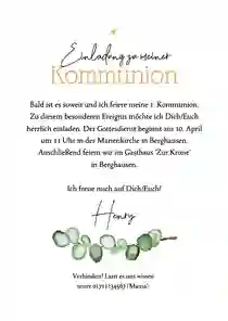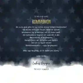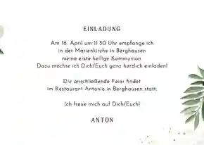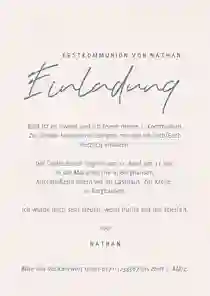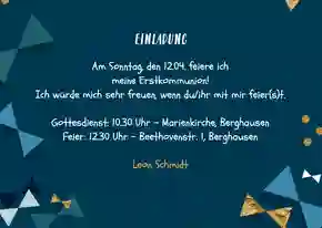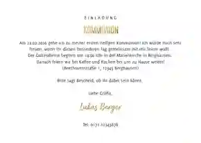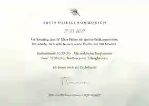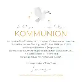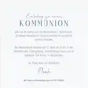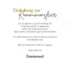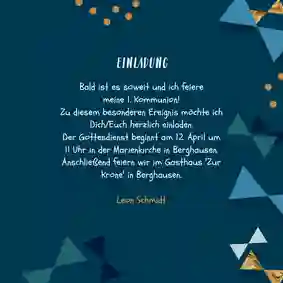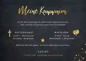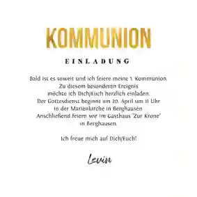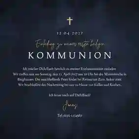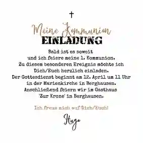 Entscheide dich zum Beispiel für eine Kommunionskarte im Betonlook, eine Karte mit Fußball oder mit toller großer Typografie. Und auch christliche Symbole eignen sich perfekt für die Einladung zur Kommunion deines Jungen. Die Symbole sprechen sinnbildlich für die Kommunionsfeier und integrieren sich außerdem stilvoll in dein Kartendesign. Eine Einladungskarte zur Kommunion mit eigenem Foto macht deine Einladung noch persönlicher.