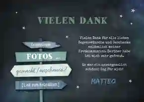 Kommunionseinladung mit Wegweiser. Schrift und Sternchen in Silberdruck (wahlweise). (Für quadratische Karten fallen extra Portokosten an.)