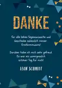 Menükarte zur Kommunion mit goldener Typografie (kein Golddruck) und Konfetti. Nur noch eigene Speisen eintragen. Guten Appetit!
