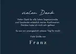 Auch praktisch: Dankeskarten zur Konfirmation sind die perfekte Möglichkeit, um dich für Geschenke und kleine Aufmerksamkeiten zu bedanken. Und mit einer stilvollen Glückwunschkarte zur Konfirmation kannst du deinen persönlichen Gratulationen den passenden Rahmen geben. Tipps und Beispieltexte zur Beglückwünschung findest du übrigens auch in unserem Blog.
