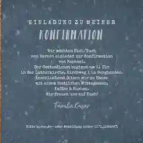So kannst du deine Gäste mit hippen Einladungskarten zur Konfirmation einladen oder mit hippen Dankeskarten Konfirmation Danke sagen. Auch die Menükarten zur Konfirmation kannst du selbst entwerfen und als trendige Tischdekoration für die Feier verwenden.