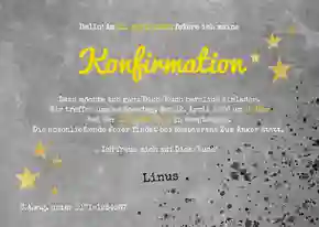 Trendy Menükarte zur Konfirmation im Betonlook mit Polaroid Foto und Sternen. Alle Texte sind anpassbar. Nur noch eigene Speisen eintragen!
