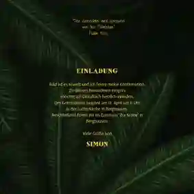 Trendy Menükarte zur Konfirmation mit großen Palmenblättern. Mit dem Dschungel-Look liegst du sicher im Trend!