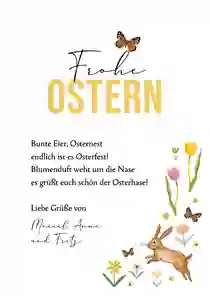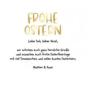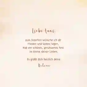Du hast das Design deiner Karte fertiggestellt? Dann verleihe dem Inneren deiner Osterkarte mit persönlichen Worten, Gedichten oder Ostergrüßen den letzten Schliff. So werden deine Ostergrüße nicht nur optisch, sondern auch inhaltlich zu einem ganz besonderen Highlight.