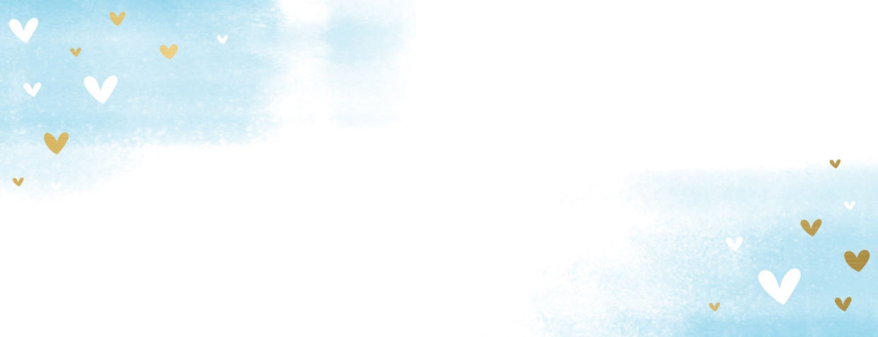 Adressaufkleber mit blauem Aquarell und weißen und goldenen Herzchen.