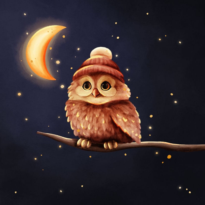Kleine Eule mit Mütze auf einem Ast mit Mond und Sternen im Nachthimmel.