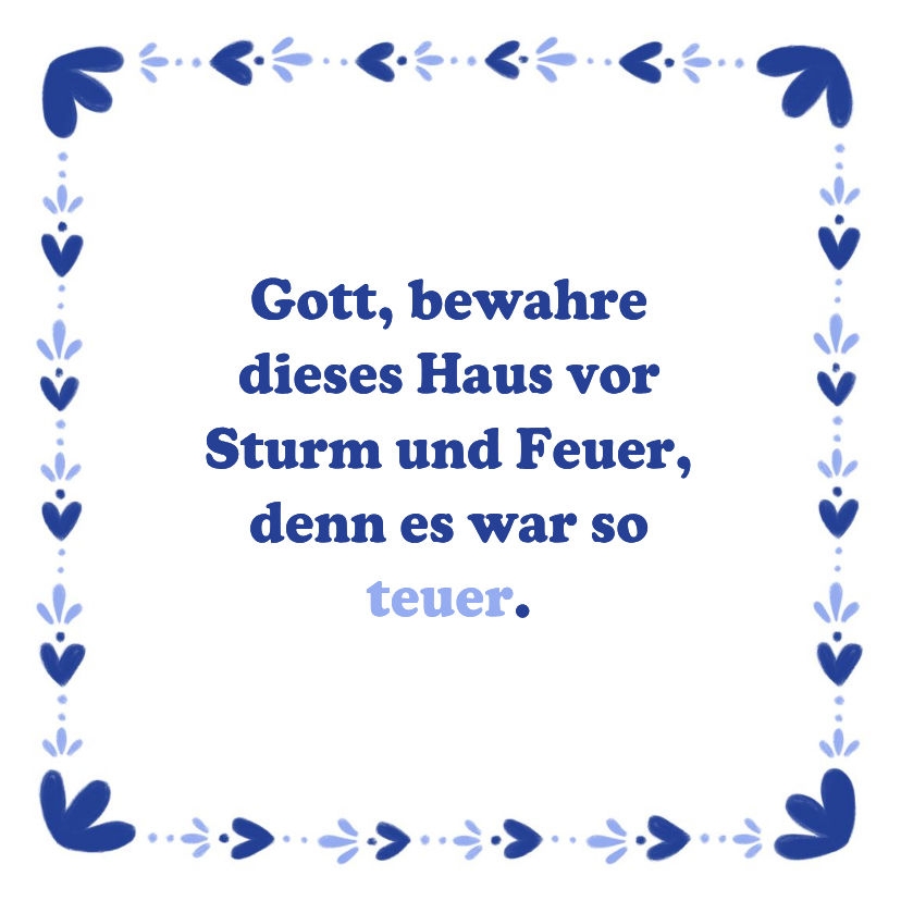 Originelle Dekofliese mit lustigem Spruch zum Haussegen in traditionellem Delfter Design.