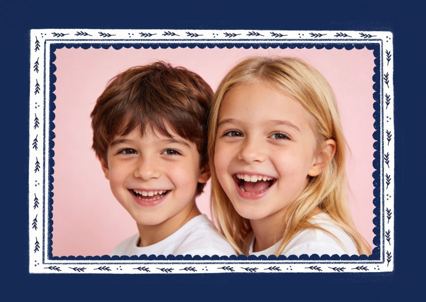 Fliese mit eigenem Foto und blauem Rahmen in Delftblau, als Querformat.