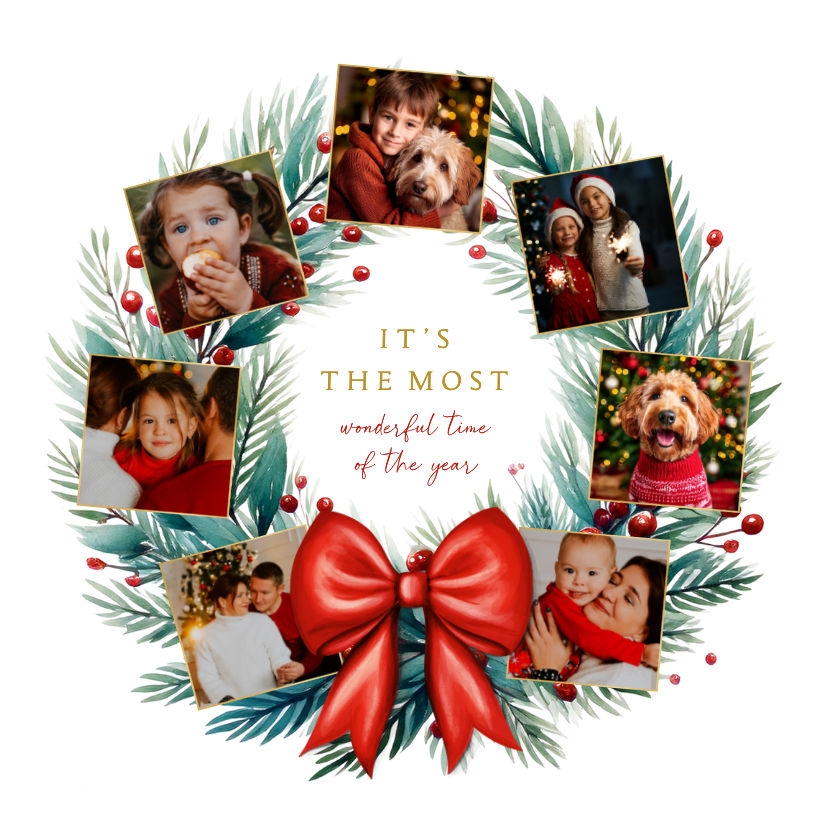 Die schönsten Familienfotos festgehalten als Dekofliese zu Weihnachten, mit Weihnachtskranz und Schleife.