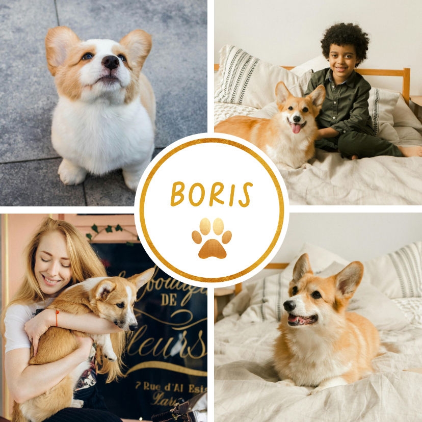 Persönliche Dekofliese mit Platz für 4 eigene Fotos von deinem Haustier, mit goldener Pfote und Name.