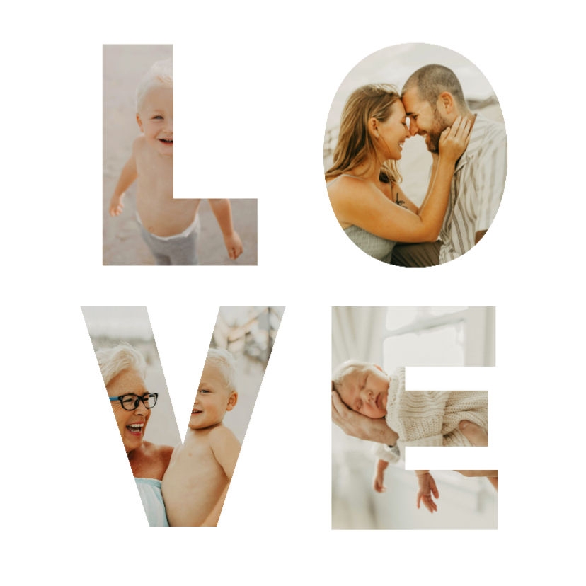 Weiße Dekofliese mit eigenen Fotos in Buchstaben L O V E als Collage.