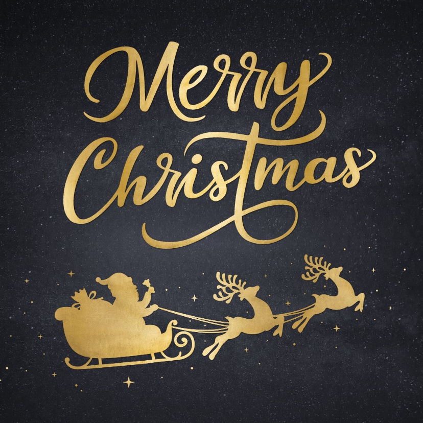 Dekofliese zu Weihnachten mit goldenem Schlitten, Rentieren und Weihnachtsmann auf Schwarz.