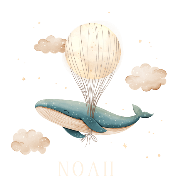 Ein eigenes Nachtlicht mit Name und niedlicher Illustration von einem Wal mit Heißluftballon.