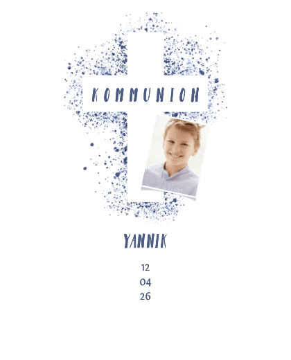 Wimpelkette zur Kommunionsfeier mit eigenen Fotos und Kreuz aus blauen Farbspritzern.