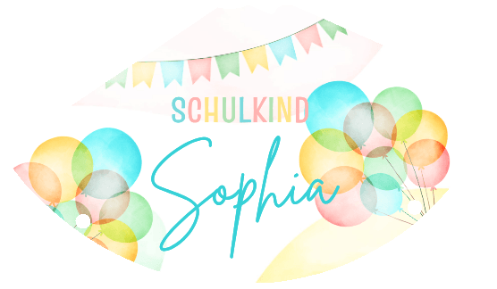 Partyhut in fröhlichen Farben mit Namen vom Schulkind und bunten Luftballons.