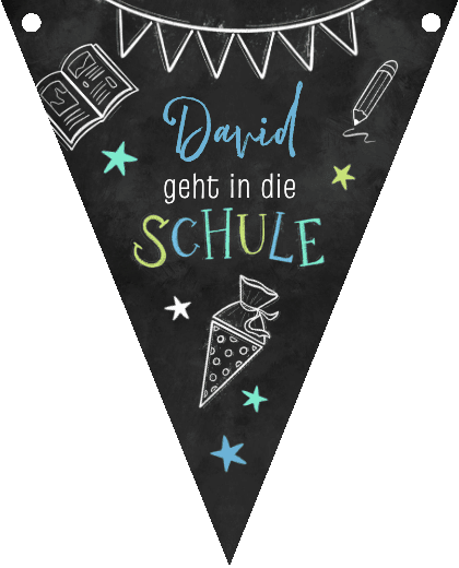 Wimpelkette zur Einschulungsfeier mit 'Schule' in Blaugrün, Namen und Foto.