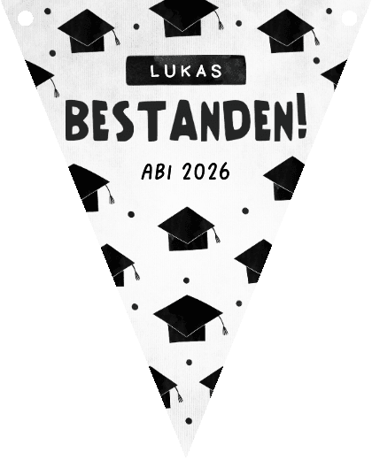 Wimpelkette mit Aufschrift 'Bestanden' und vielen kleinen schwarzen Akademikerhüten.