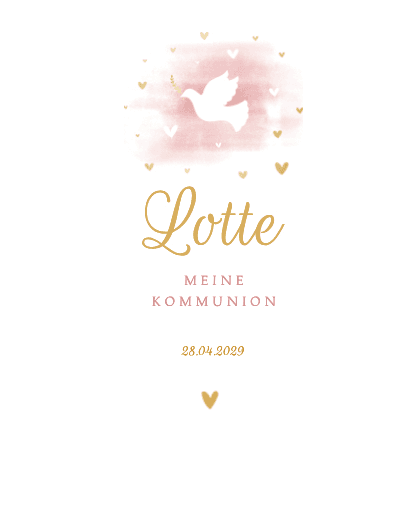 Wimpelkette zur Kommunionsfeier mit Fotos und Taube auf rosa Aquarellhintergrund.