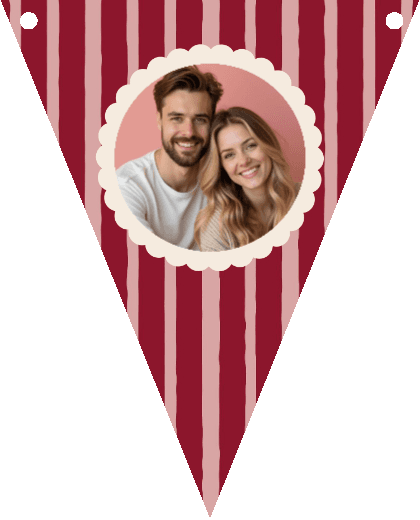 Wimpelkette mit roten Streifen, Fotos und Schrift 'LOVE'.