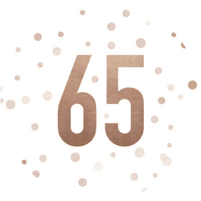 Weißer Aufkleber mit 65 und Konfetti in Kupferoptik