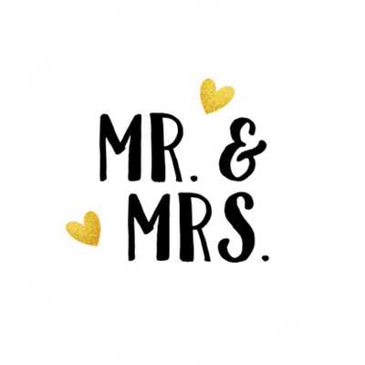 Weißer Aufkleber mit Mr. & Mrs. und kleinen Herzen