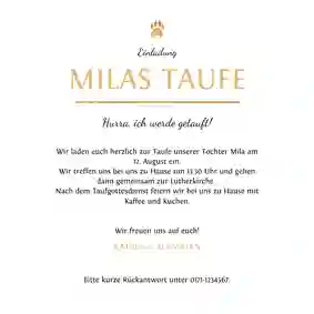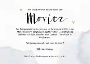 Teilen Sie Ihren Lieblingsmenschen mit, wer zu was einlädt, sowie wann und wo die Feier stattfindet. Und, dass Sie und der Zwerg sich auf ein gemeinsames Fest freuen. Sie möchten noch mehr? Besonders persönlich gestalten Sie Ihre Einladungen zur Taufe, wenn Sie handschriftlich ein paar Worte in die Karte einfügen. Entweder den ganzen Text oder zumindest Ihre Unterschrift. Der gute alte Füller erfüllt hier seinen Zweck. 🖋️