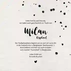 Teilen Sie Ihren Lieblingsmenschen mit, wer zu was einlädt, sowie wann und wo die Feier stattfindet. Und, dass Sie und der Zwerg sich auf ein gemeinsames Fest freuen. Sie möchten noch mehr? Besonders persönlich gestalten Sie Ihre Einladungen zur Taufe, wenn Sie handschriftlich ein paar Worte in die Karte einfügen. Entweder den ganzen Text oder zumindest Ihre Unterschrift. Der gute alte Füller erfüllt hier seinen Zweck. 🖋️