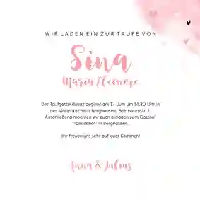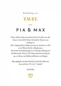 Teilen Sie Ihren Lieblingsmenschen mit, wer zu was einlädt, sowie wann und wo die Feier stattfindet. Und, dass Sie und der Zwerg sich auf ein gemeinsames Fest freuen. Sie möchten noch mehr? Besonders persönlich gestalten Sie Ihre Einladungen zur Taufe, wenn Sie handschriftlich ein paar Worte in die Karte einfügen. Entweder den ganzen Text oder zumindest Ihre Unterschrift. Der gute alte Füller erfüllt hier seinen Zweck. 🖋️