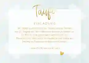 Lade aus der Sicht deines Kindes ein, verfasse Reime oder verwende Tauf-Gedichte. Außerdem verzaubern Sprüche, Zitate, Segenssprüche und Bibelstellen auf der Taufeinladung deines Sohnes. Beantworte auf jeden Fall die W-Fragen: wer, was, wann und wo. Dürfen wir dich dabei unterstützen? Dann schmökere gerne in unseren Taufeinladung-Texten. Wir haben für dich die schönsten Buchstabenkombinationen für deine Taufkarte für Jungen zusammengefasst.